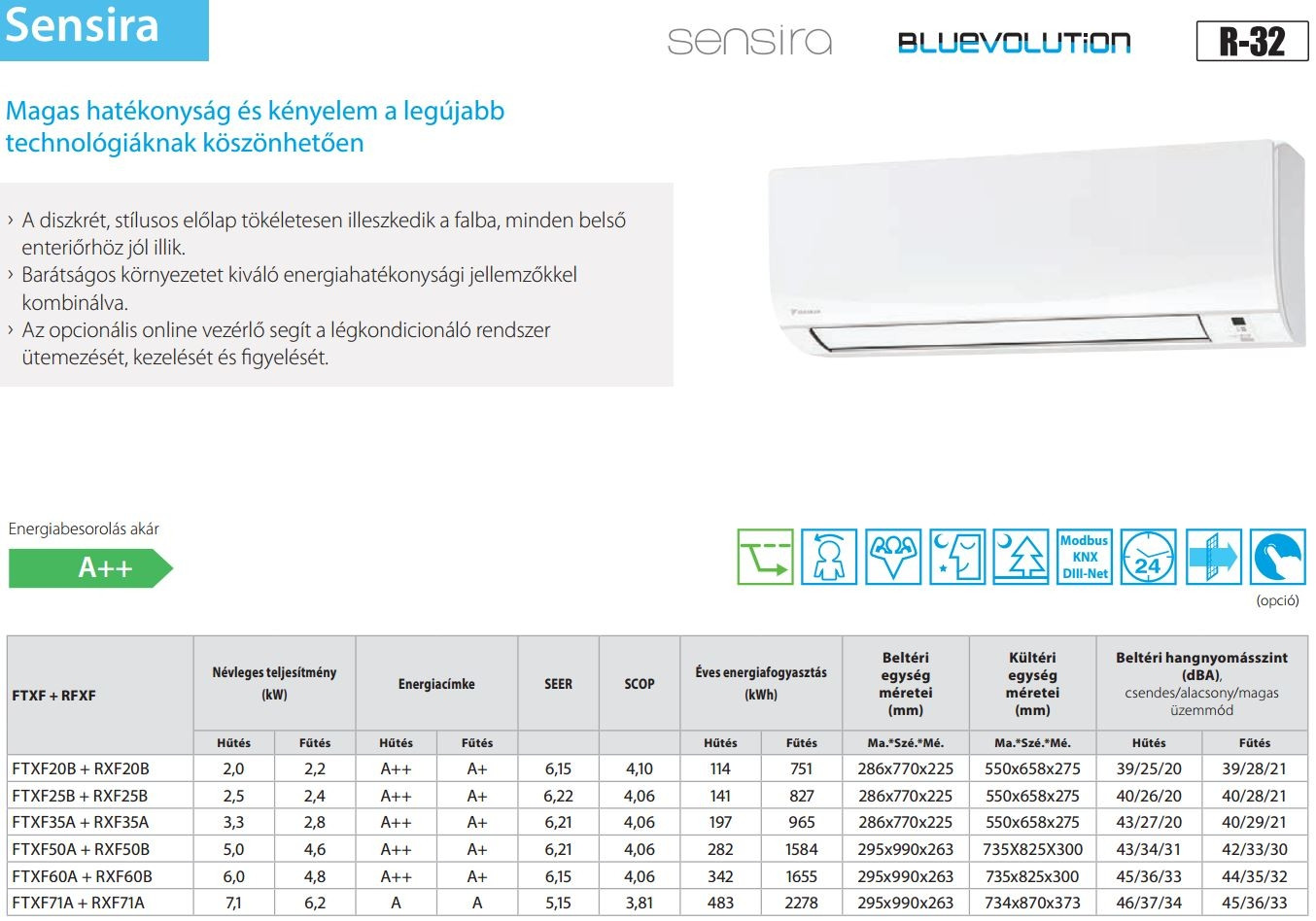 A Daikin FTXF60A / RXF60B Sensira Inverteres Split klíma fontos tulajdonságai: